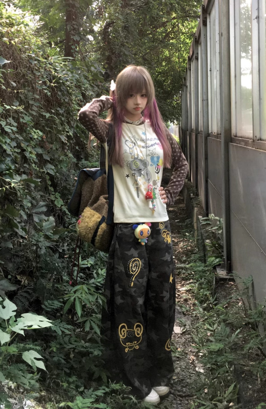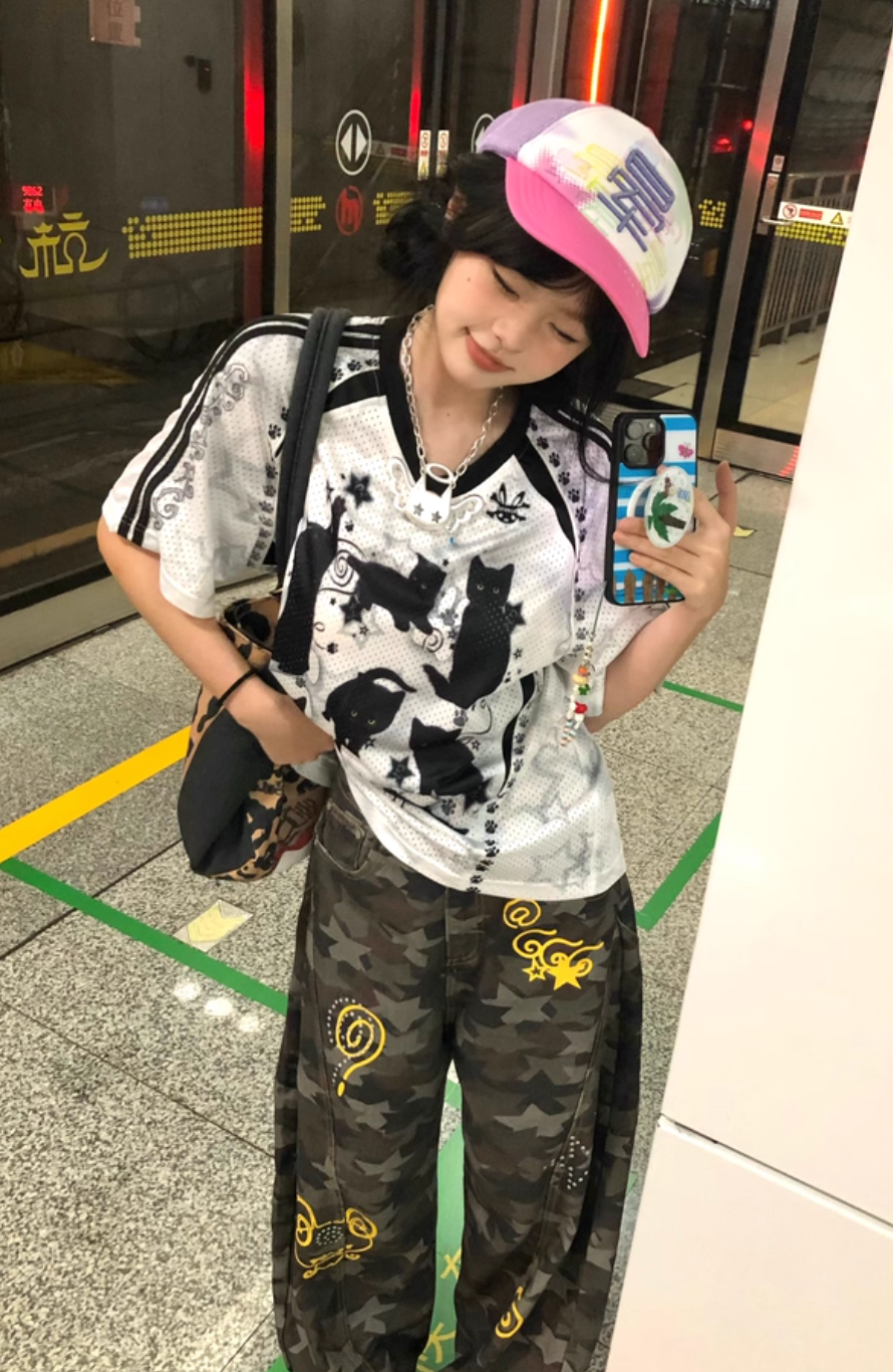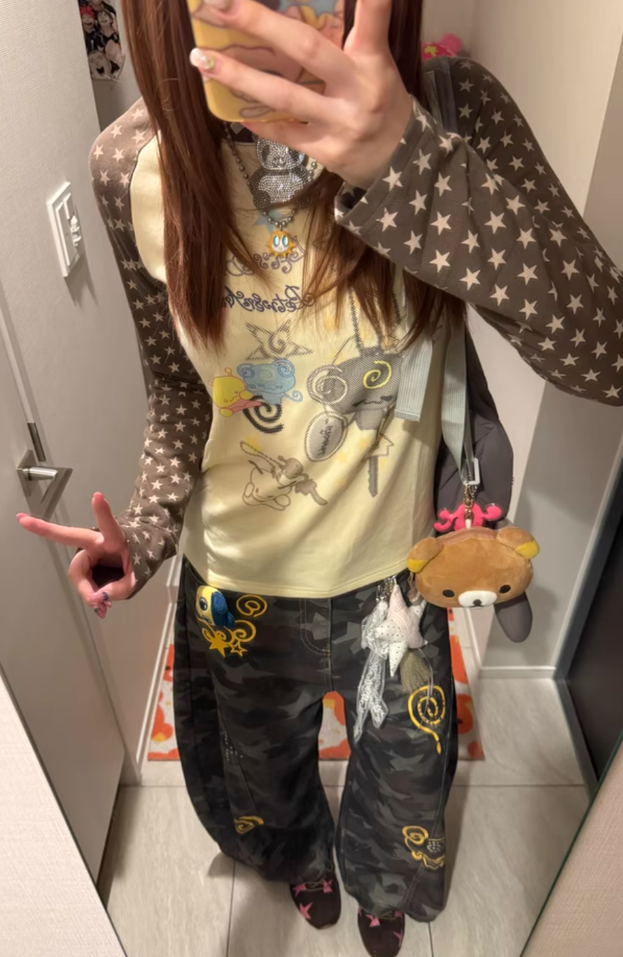 ルーズフィットデザインのカモフラージュスターラインストーンカーゴパンツ ルックブック
