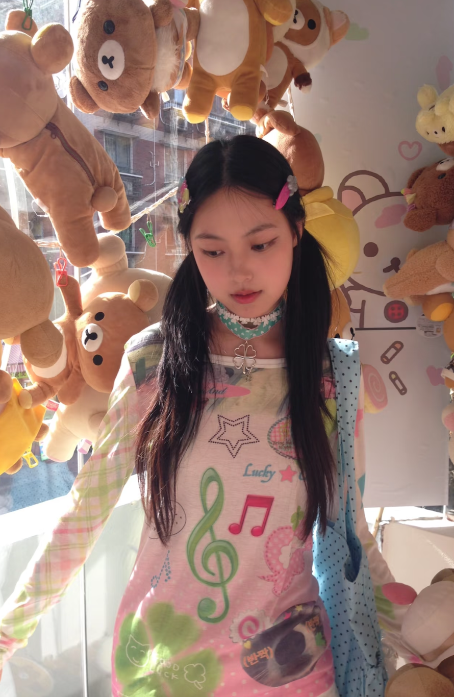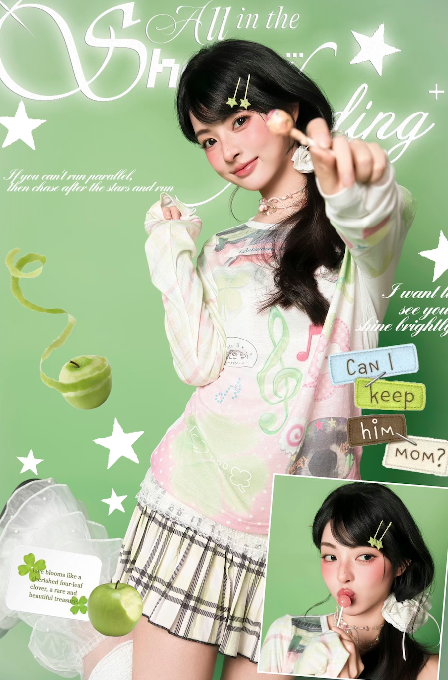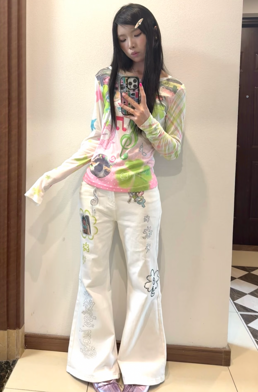 Y2K 音符プリント パッチワークデザイン ロングスリーブトップス ルックブック