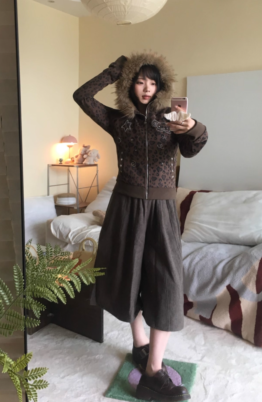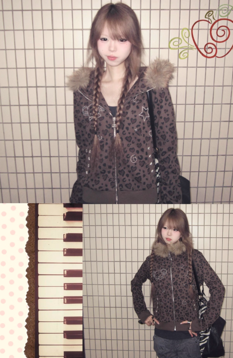 가짜 모피 칼라가 달린 브라운 레오파드 프린트 후드티 룩북