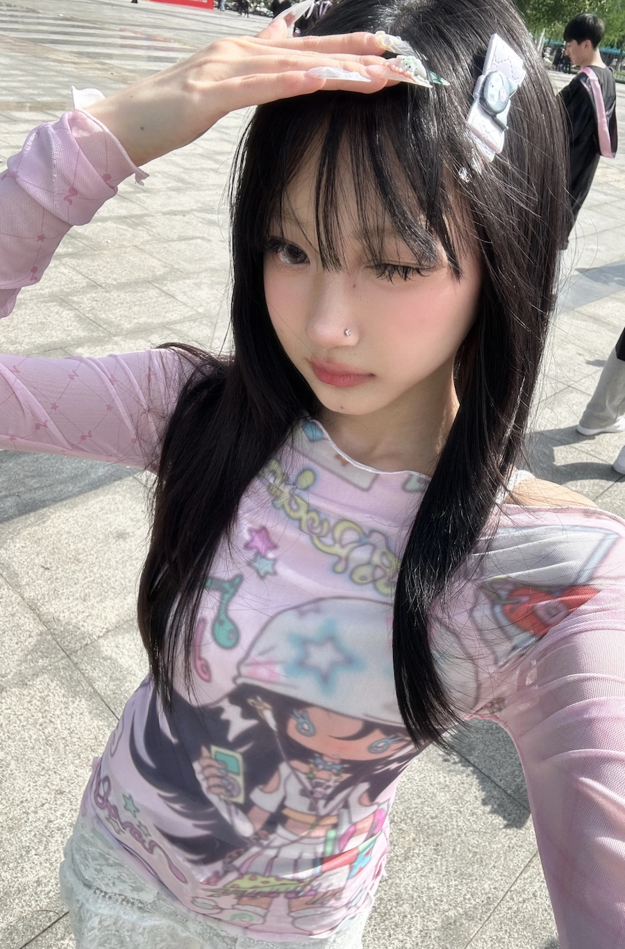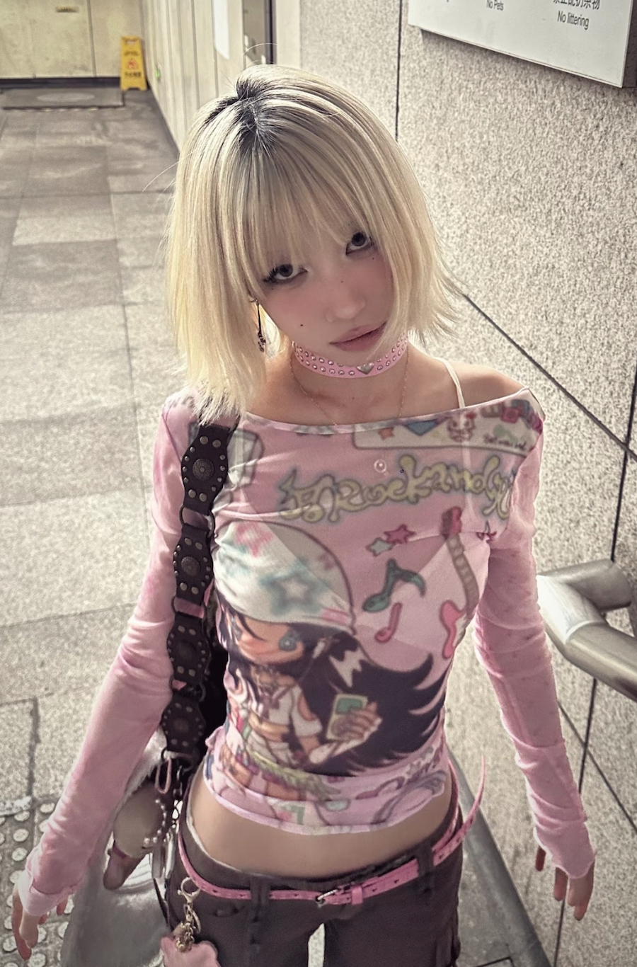Y2K 디자인의 핑크 메시 패치워크 오프숄더 탑 룩북