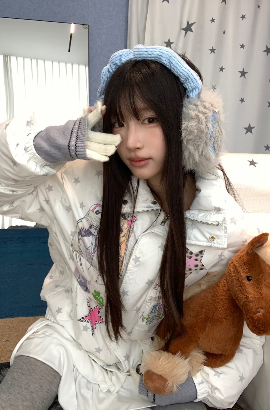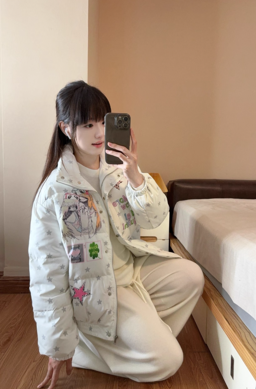 White star print down jacket with 90% duck filling and puffer design Sizing